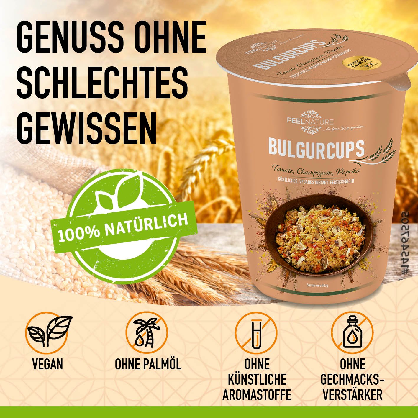 • EINZIGARTIG & LECKER – Genieße das leckere Gemüse der FEEL NATURE Bulgur Cups in der Vegetables-Variante. Tomaten. Champignons und Paprika verleihen dieser einzigartigen 5 min Terrine einen aromatisch-runden Geschmack. der sich perfekt mit dem nussigen Bulgur ergänzt.