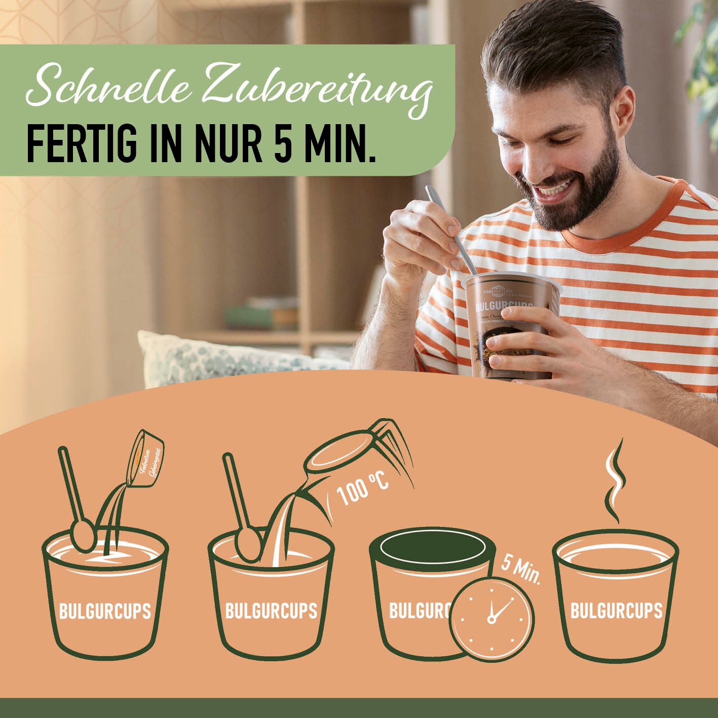 • GANZ EASY – Einfach den Deckel abnehmen. die Sauce herausnehmen. unterrühren und mit 80 ml kochendem Wasser auffüllen. Schon bist du nur noch 5 min von deinem köstlichen Bulgur-Gericht entfernt – perfekt für unterwegs oder den schnellen Hunger zwischendurch!