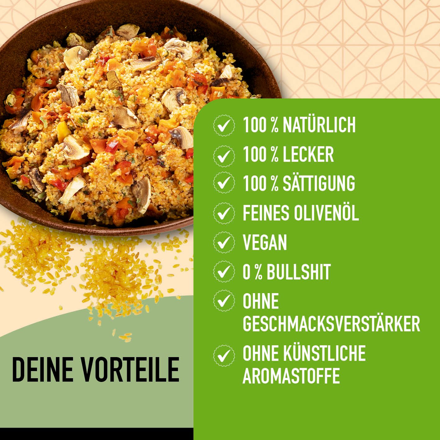 • VEGAN & AUSGEWÄHLTE ZUTATEN – Gönn dir eine köstliche und nahrhafte Mahlzeit mit den vollständig veganen Bulgurcups die frei von Palmöl. Geschmacksverstärkern und künstlichen Aromen sind.