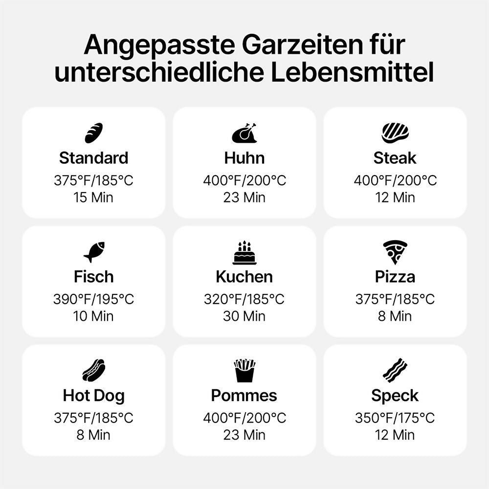 - ✓ Vielseitige Kochoptionen: Kommt mit 8 Kochvoreinstellungen. um verschiedene Lebensmittelarten wie Hühnchen. Steak. Fisch. Pizza und mehr zu verwalten. was jedes Mal perfekte Ergebnisse sicherstellt.